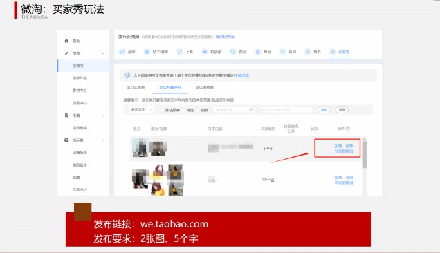 进入到买家秀玩法,买家秀的发布非常简单。首先进入微淘后台界面,然后选择买家秀,带图评价内容,点击转发到微淘。买家秀的图文要求是2个图,5个字。符合要求的可以直接进行转发。