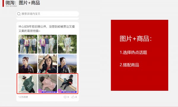 选用店铺人群喜爱的热点话题,一般选择6张,然后在下方,排列3个店铺商品。这样这篇图片+商品的内容,就能既起到蹭热点又可以为店铺带流量的作用了。
