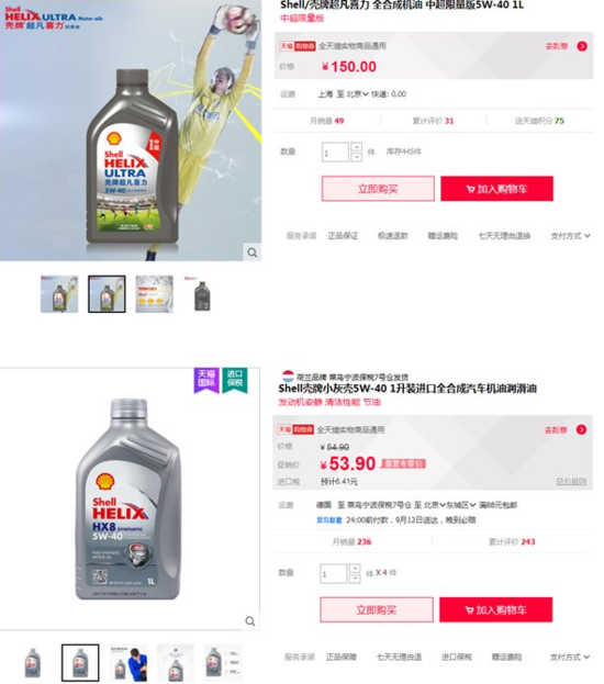 目前在天猫国际上搜索“壳牌”字样,依旧还有多位商家公开售卖壳牌的润滑油产品,且月销量不菲。而对比同样5W-40的“1升装全合成机油”,天猫国际与天猫旗舰店的价位分别是53.9和150元,两者价位悬殊巨大,间接导致天猫壳牌官方旗舰店的月销售额受到冲击影响。